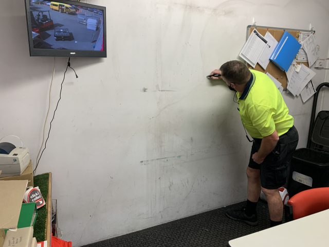 Deficiency:Two water leaks have been found in the warehouse TV showroom and the storage room office. In one area we have found that there are cracks on the concreate wall on the ground level (The side of the train tracks) we believe that water is getting in though the cracks. One of The Warehouse team, marked the wall with a vivid to show where the one of cracks run from, as per the above photo.